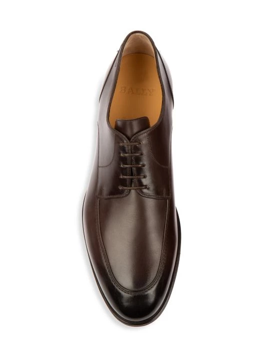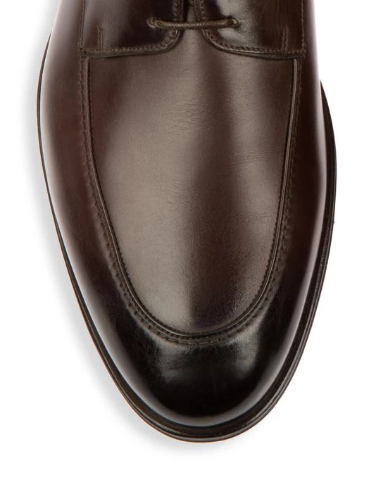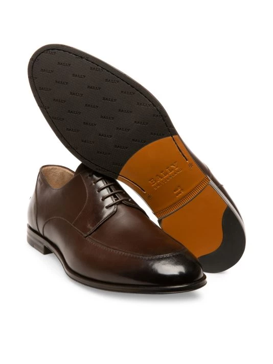 Polished leather dress shoes topped with embossed logo detail feature an apron toe and classic lace-up design.