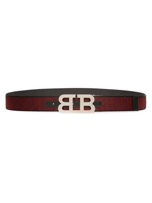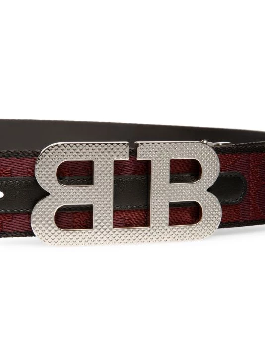 A textured mirrored logo buckle centers this striped, reversible belt.