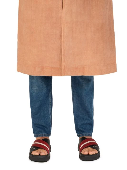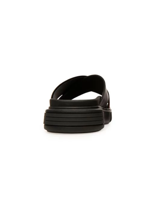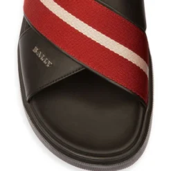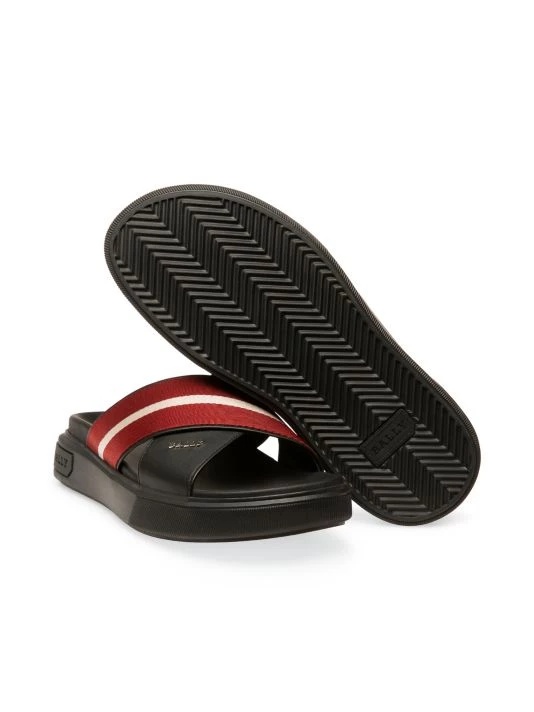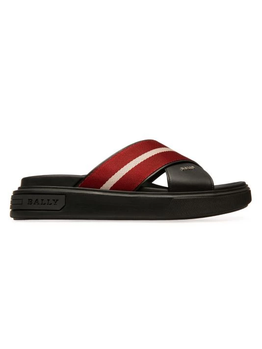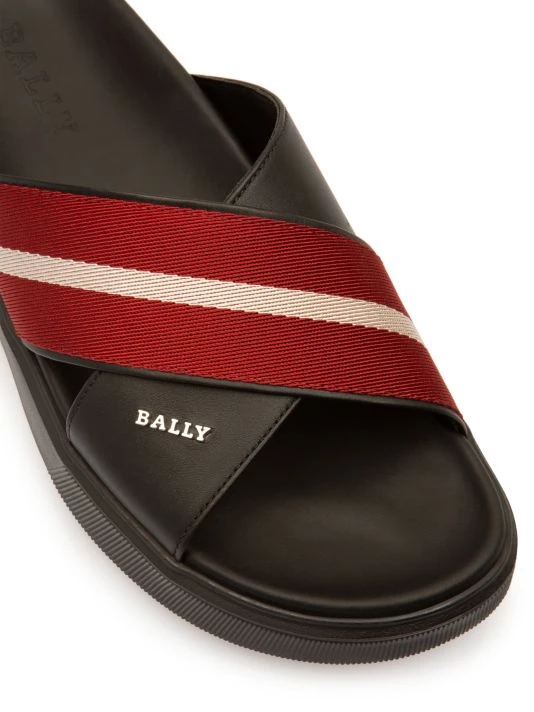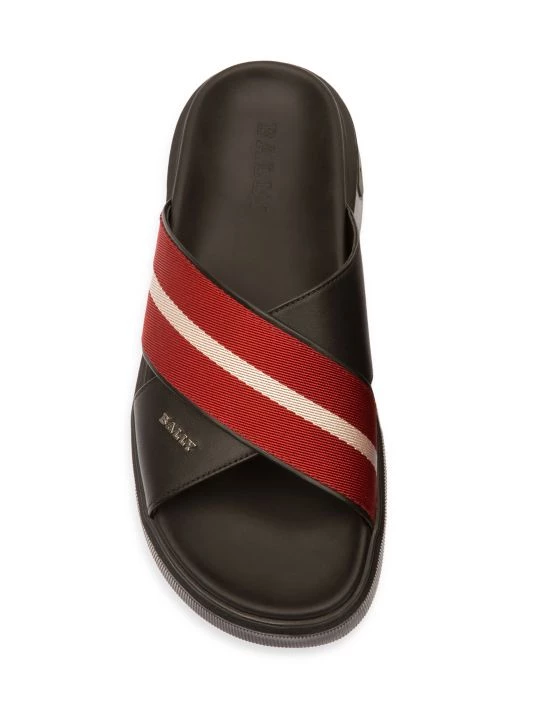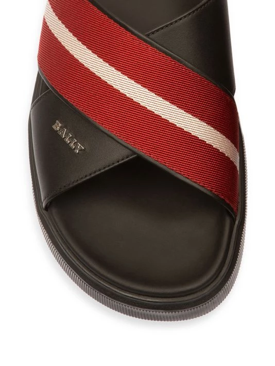 Boasting a cross strap design, these slide sandals are crafted of smooth leather with a striped fabric overlay.