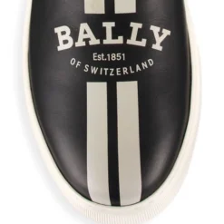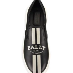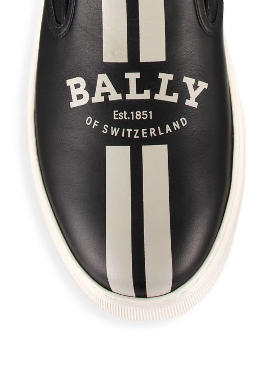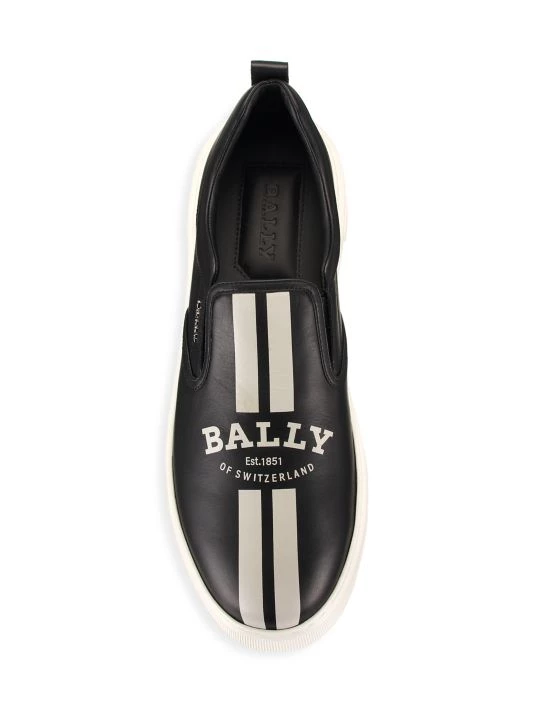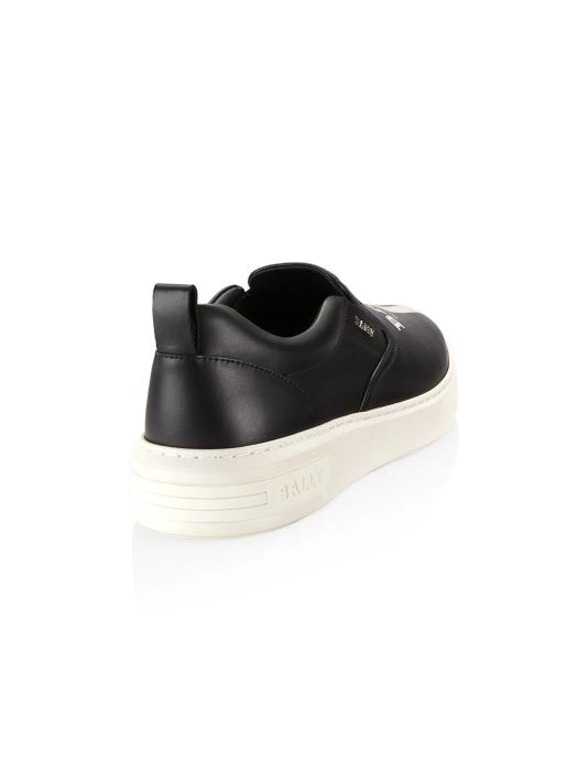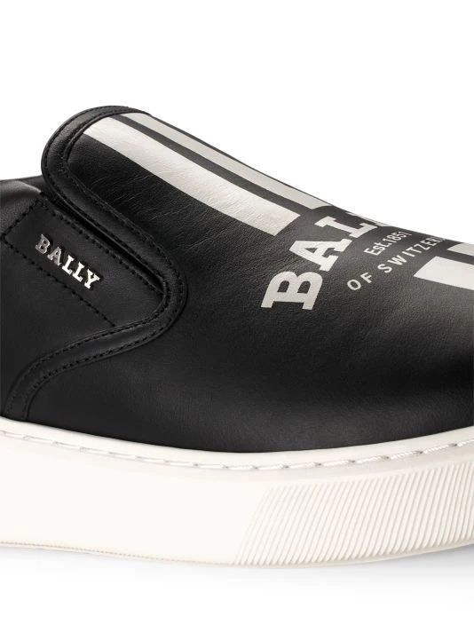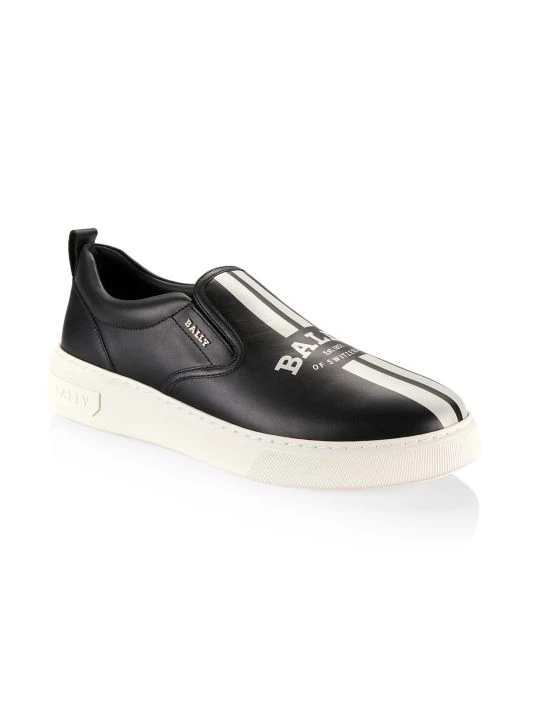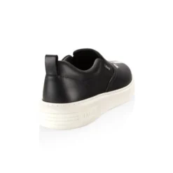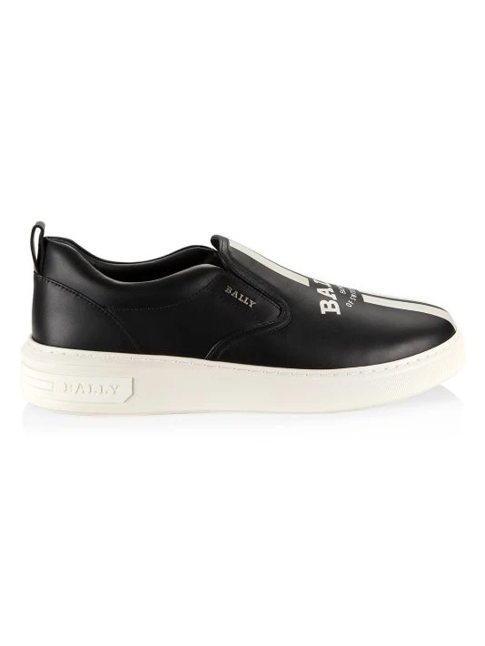 These leather slip-on sneakers feature the brand name across the top and sport a thick rubber sole.